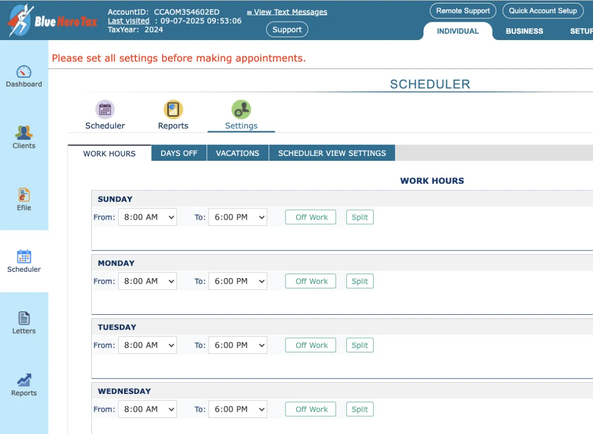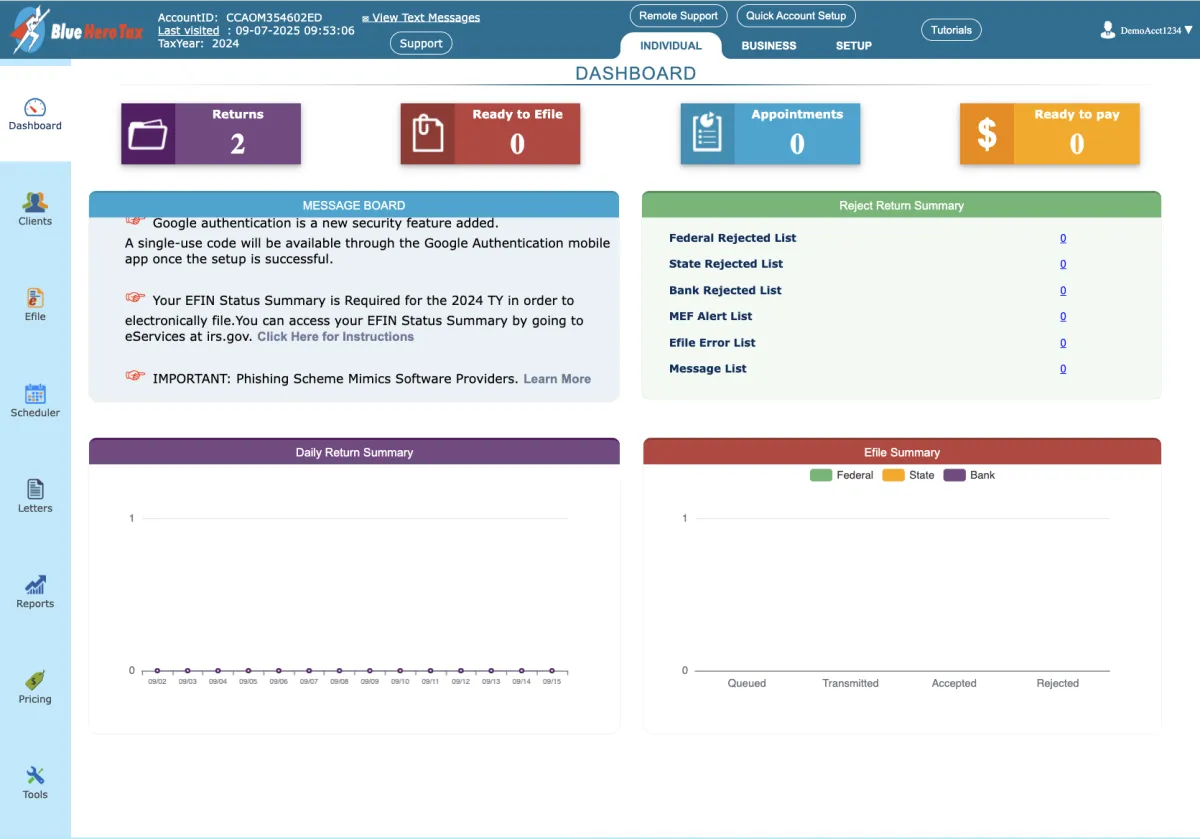 Blue Hero Tax cloud-based software allows you to prepare and file tax returns from any device, providing flexibility and convenience to both you and your customer.